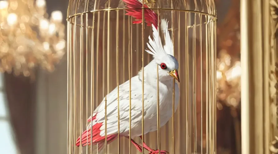 En una jaula hecha también de oro adornada de rubíes y esmeraldas, colgada del techo a gran altura, estaba el Pájaro Dulce Encanto, que era así como del tamaño de un pájaro carpintero, pero de plumas blancas, copete rojo y las patas de un rosado coral.
