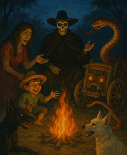 Todos asienten. La Siguanaba se acomoda el pelo, el Cipitío recoge sus semillas, los Cadejos se desperezan, la Culebra da un golpe seco contra la raíz y la Carreta Chillona hace sonar sus ruedas. Se retiran uno por uno, riéndose como conspiradores.
